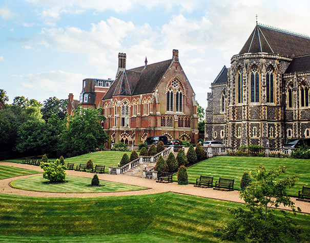 ハロウ校は、ヒースロー空港から北へ車で約30分程の距離に所在します。ロンドン郊外にある丘の上の小さな町です。1つの敷地内に校舎や寮や施設が全てあるタイプの学校ではなく、オックスフォードやケンブリッジ大学、イートン校と同様に、ハロウ・オン・ザ・ヒルという街のあちらこちらに校舎や寮、施設が建っています(とても小さな町なので全て徒歩で直ぐです)。
